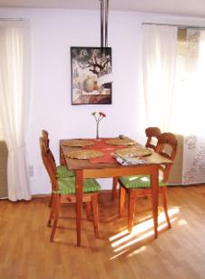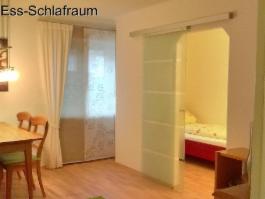 Der Wohnbereich ist mit einem Esstisch, 4 Stühlen, 2 Einzelbetten, (diese sind durch eine Trennwand mit Schiebetüre vom Wohnraum getrennt), Fernseher, Stereoanlage, kostenlosen Internetanschluss (W-LAN) ausgestattet. Der Schlafbereich li, der durch einen offenen Zugang durch das Wohnzimmer zu erreichen ist, ist ebenfalls mit 2 Einzelbetten und einem Kleiderschrank ausgestattet.