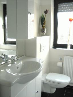 Das Badezimmer ist mit einer Dusche, Waschbecken und Toilette ausgestattet. Eine weitere Toilette befindet sich außerhalb auf dem Flur.